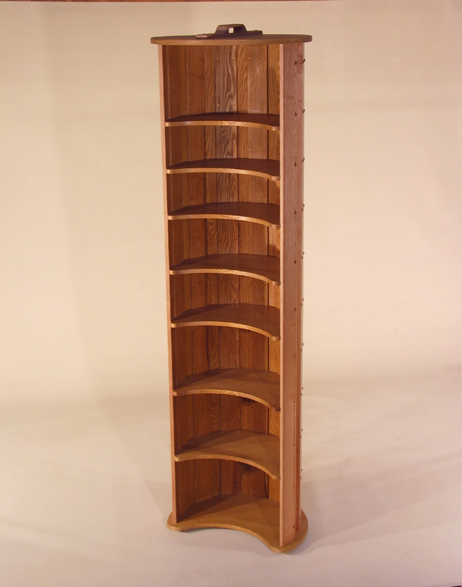 A very tall slim bookcase which holds a lot of books with a small footprint. Its copper riveted round back makes an attractive column feature. Photographed in ash. In stock in cedar. 7’4.5″ high x 2′ (60cm) diameter. To commission the dimensions are variable.