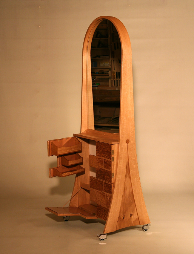 The mirror cabinet opens to reveal compartments lined with leather. Two-hundred-year-old Russia leather in the top pockets and oak-bark tanned leather in the others. The mirror is mounted on wheels so can be moved to catch natural light.