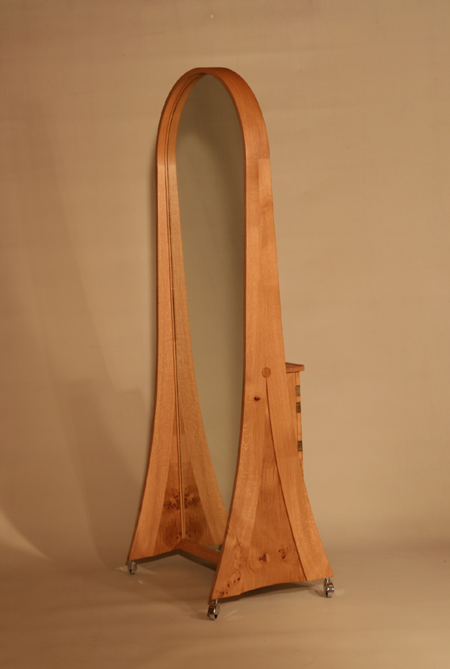 From this side, a very elegant steam bent free-standing full length mirror. From the other, a dressing mirror with compartments for everything. See next picture.