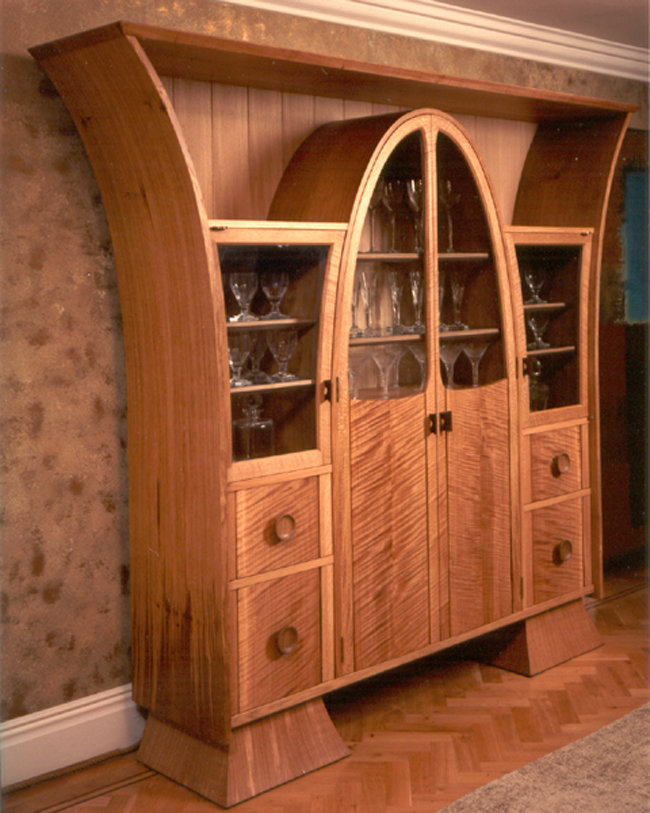 A very substantial and major piece, the Olivia Cabinet has rippled oak front, solid oak steam bent carcase and blown glass in the doors. The elliptical central arch is made from one continuous steambent piece. The doorframes are steam bent and beautifully detailed,