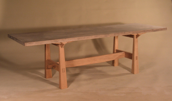 The Mill Table is a refectory table distinguished by its detailing. The rail can have initials and dates carved into it. The wedges are removable and the whole table can be flat packed. A very strong and practical construction, the flared legs, the shape of the wedges and the rail and of course the top are all typical of Petter Southall’s designs. 6ft 6in x 3ft 3in (2m x 1m)