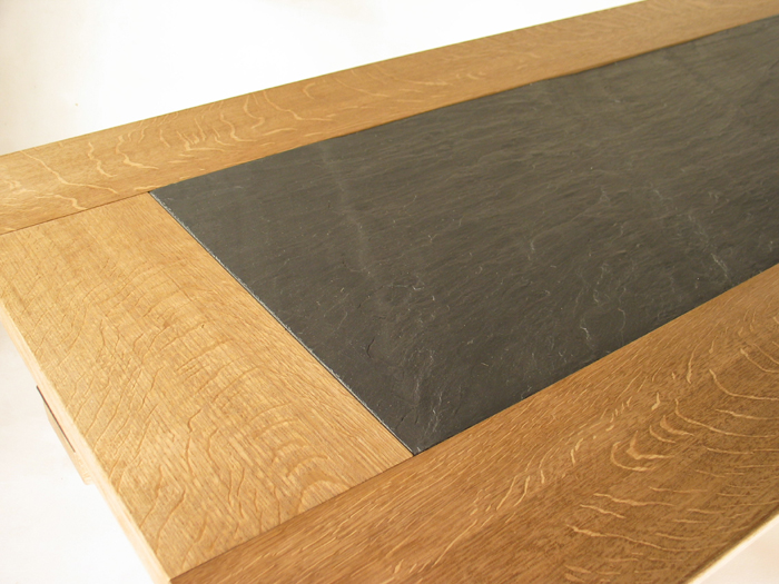 Shown in solid brown oak with Welsh blue slate top. Hinged top extended widthwise. 6ft 7in (200cm) x 20in (51cm) extending to 35in (89cm) price on application.