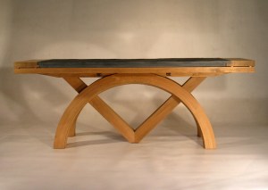 Shown in solid brown oak with Welsh blue slate top. Hinged top extended widthwise. 6ft 7in (200cm) x 20in (51cm) extending to 35in (89cm) price on application.