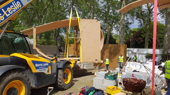 The Wave Pavilion is 300 cm high at the highest point by 164 cm deep by 488 cm long. It splits in two for transportation by lorry and can be manoeuvred on its strong wooden base.