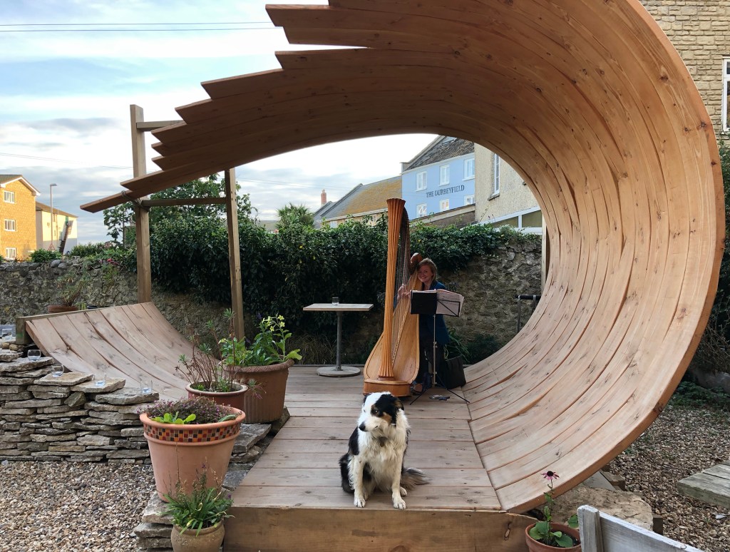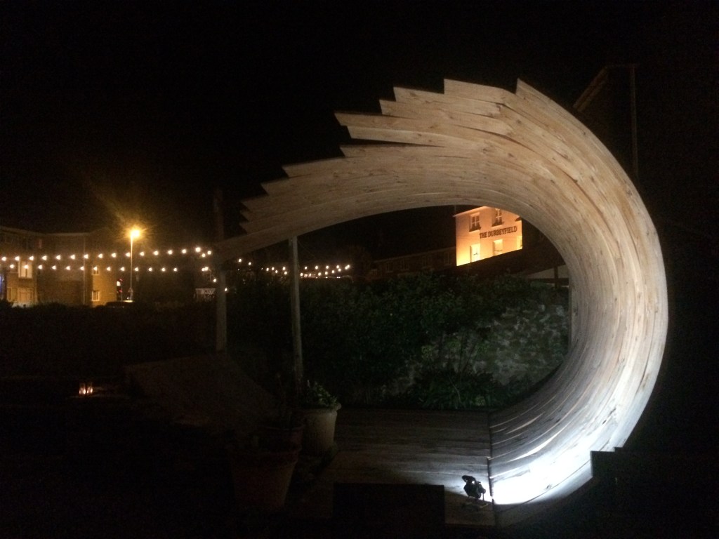 A truly elegant sculptural form, the Wave is a stunning focus in any space. Place it to give shelter from a prevailing wind as a place of tranquility or as a performance space. It could be indoors or outside. It has now started to turn a beautiful natural grey and has had no trouble surviving the wildest wettest British winter in a long time.